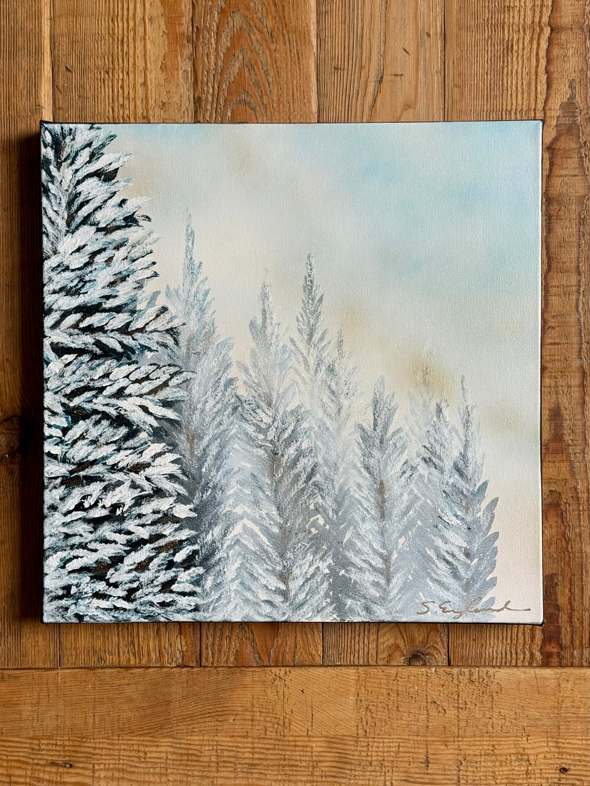 Small snowy landscape oil painting on gallery wrapped canvas. Sides are painted black.