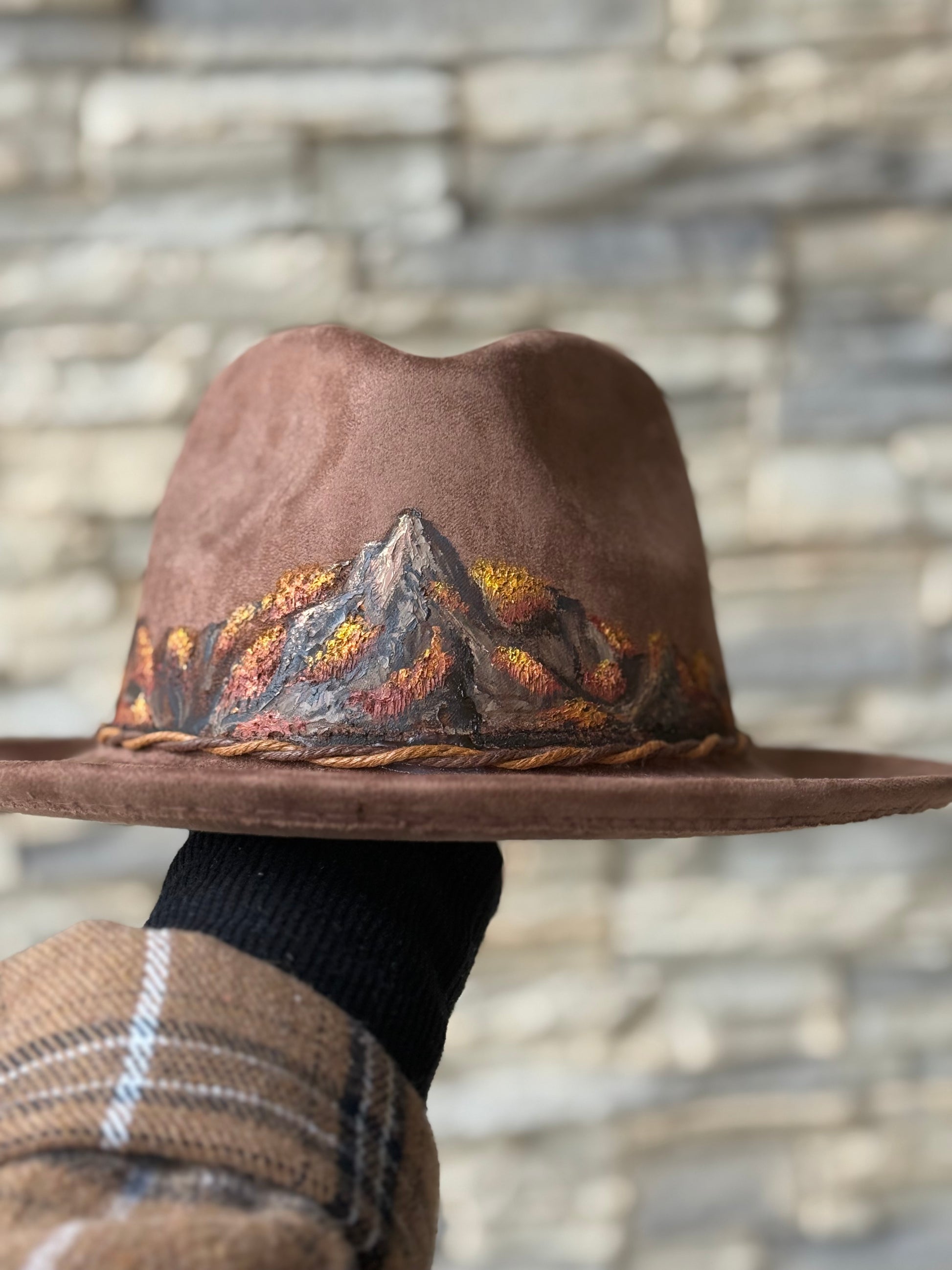 Hand painted fall mountain scene painted half way around the hat and embellished with two leather rope colors twisted.