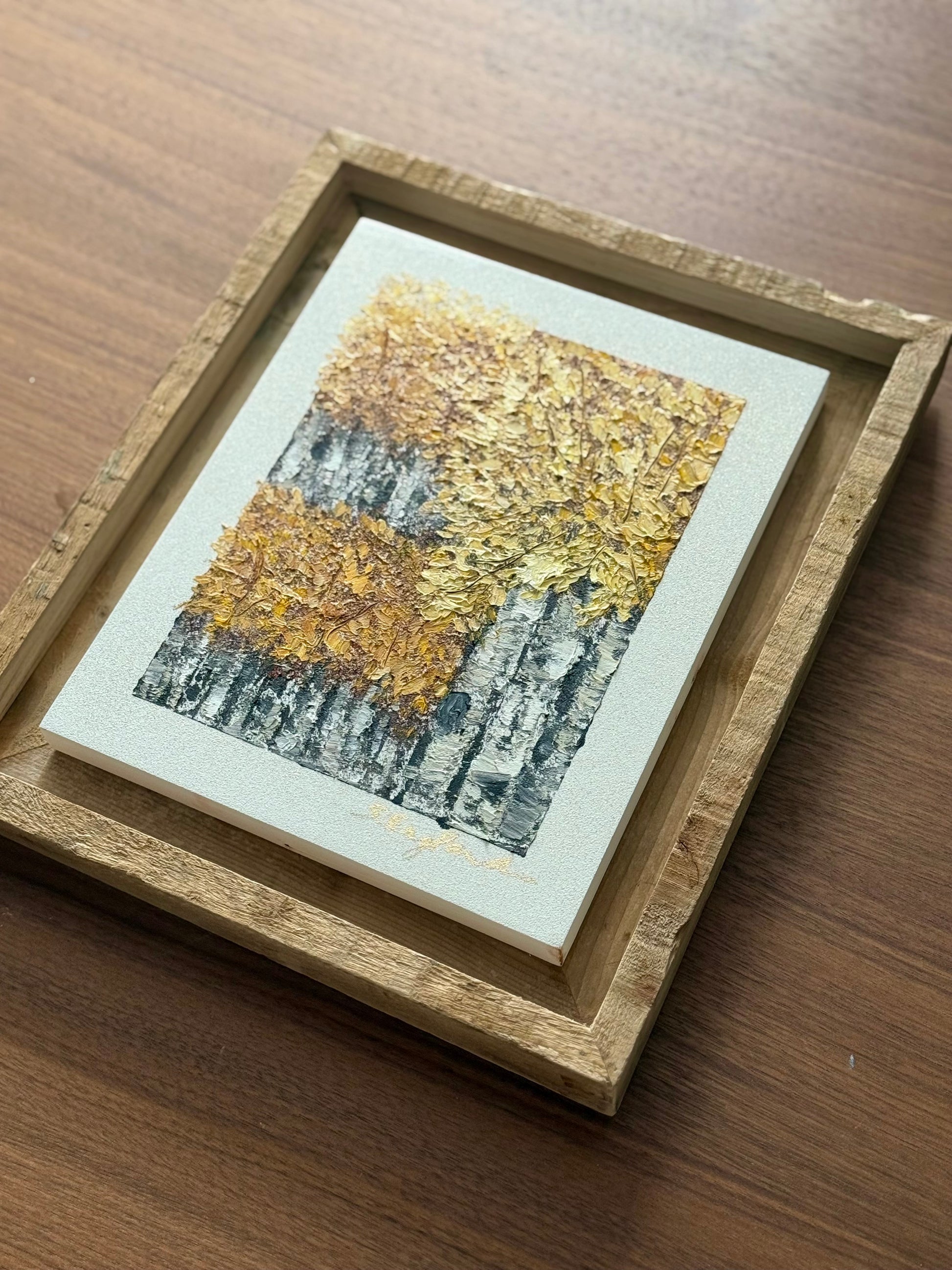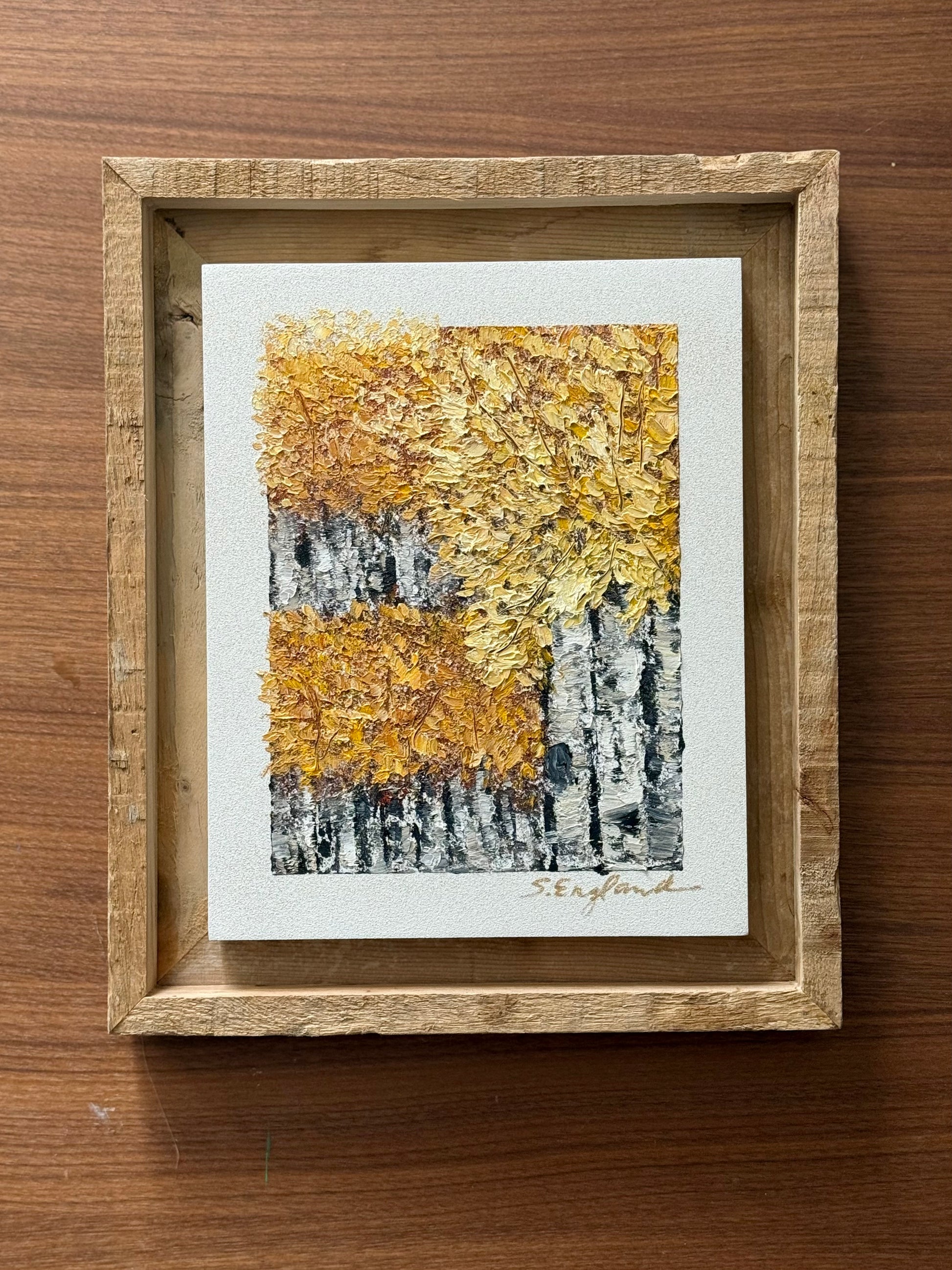Framed in a natural wood frame. Frame is 11x13" big.