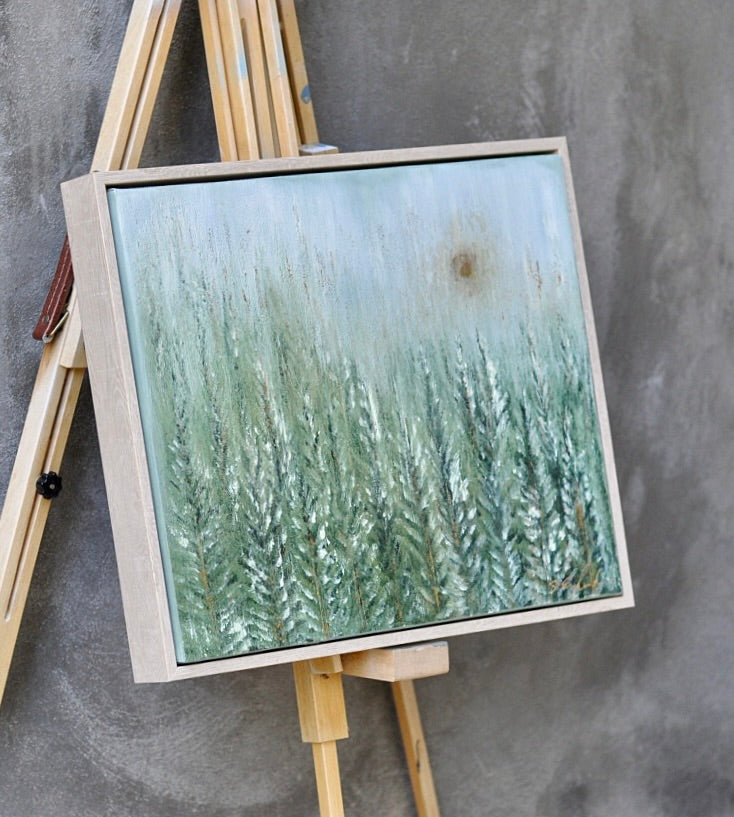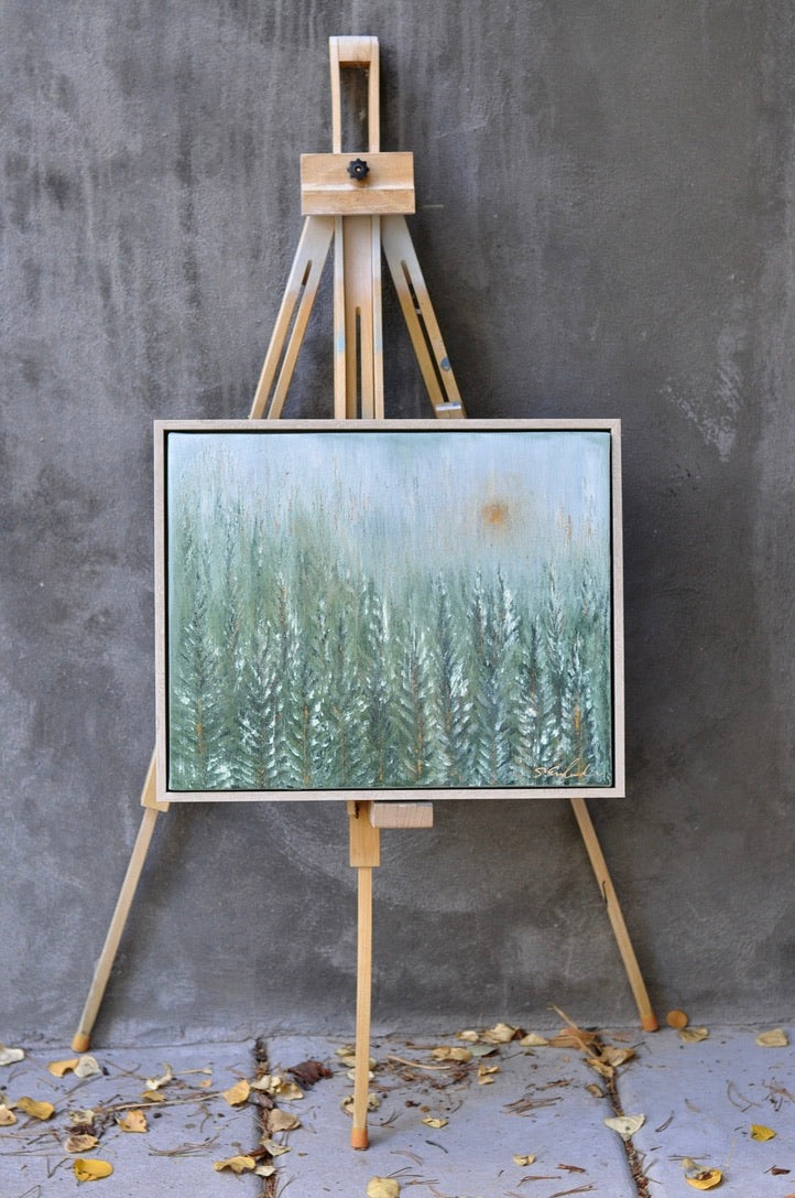 Painted on gallery wrapped canvas with spray paints and oil paints. Framed with a natural wood floating frame. Decorate your home with art.
