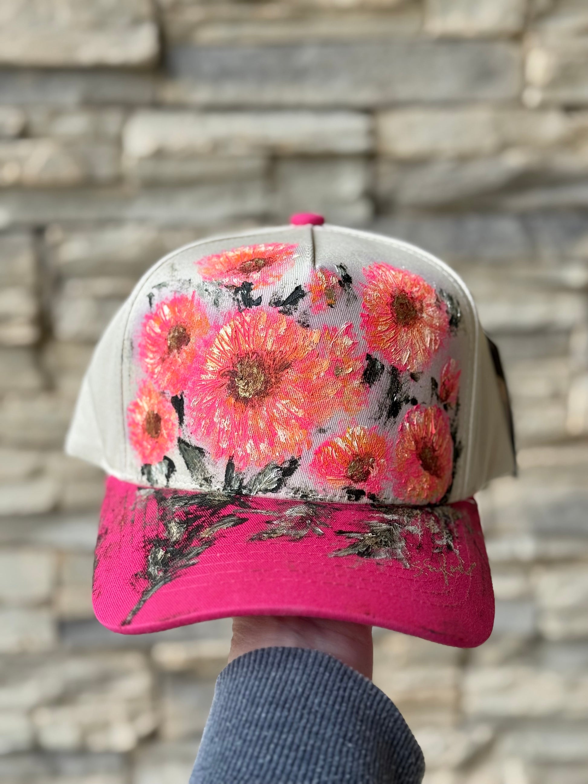 Hand painted bright pink wild flowers on a cream and pink trucker hat.