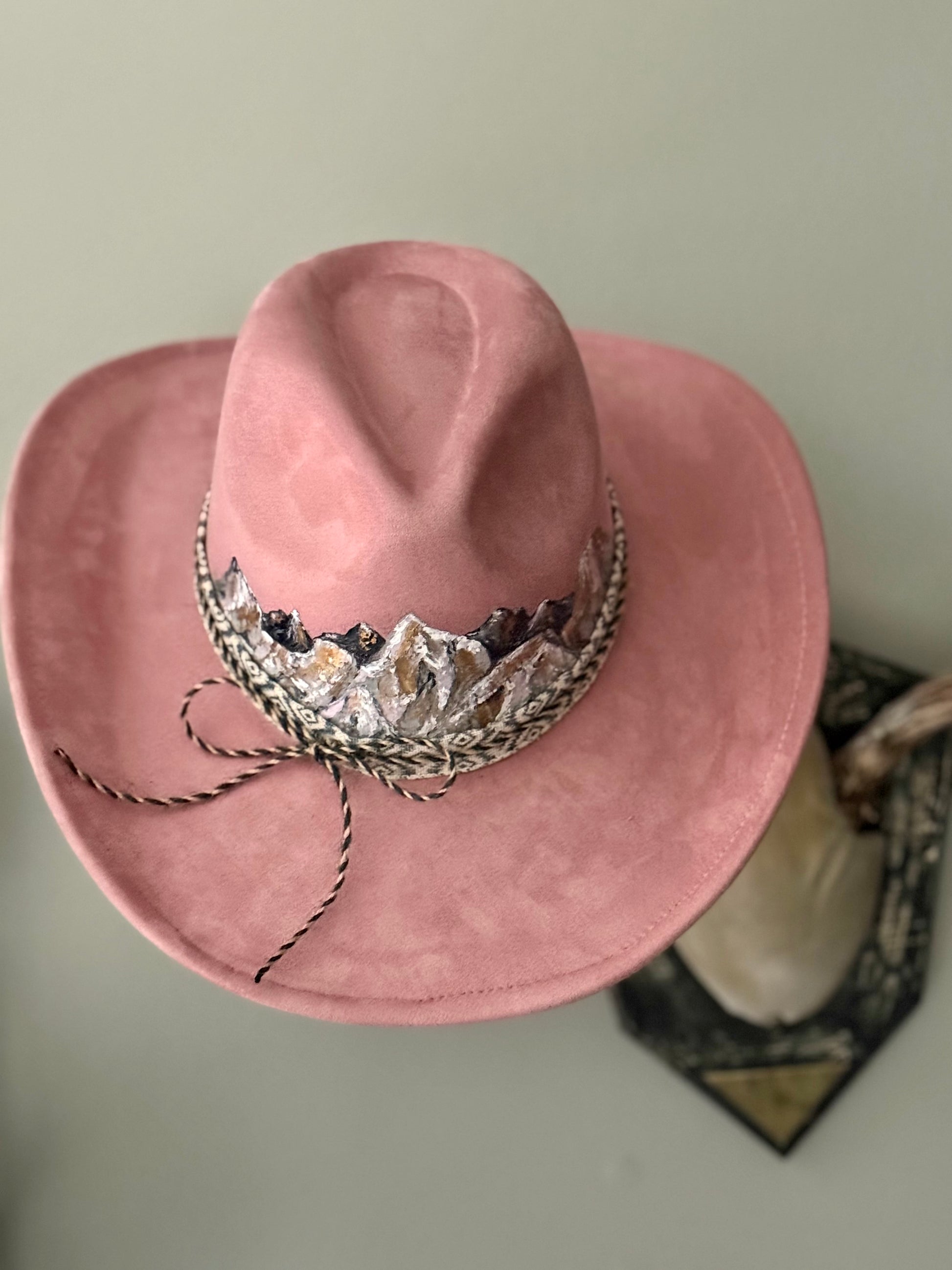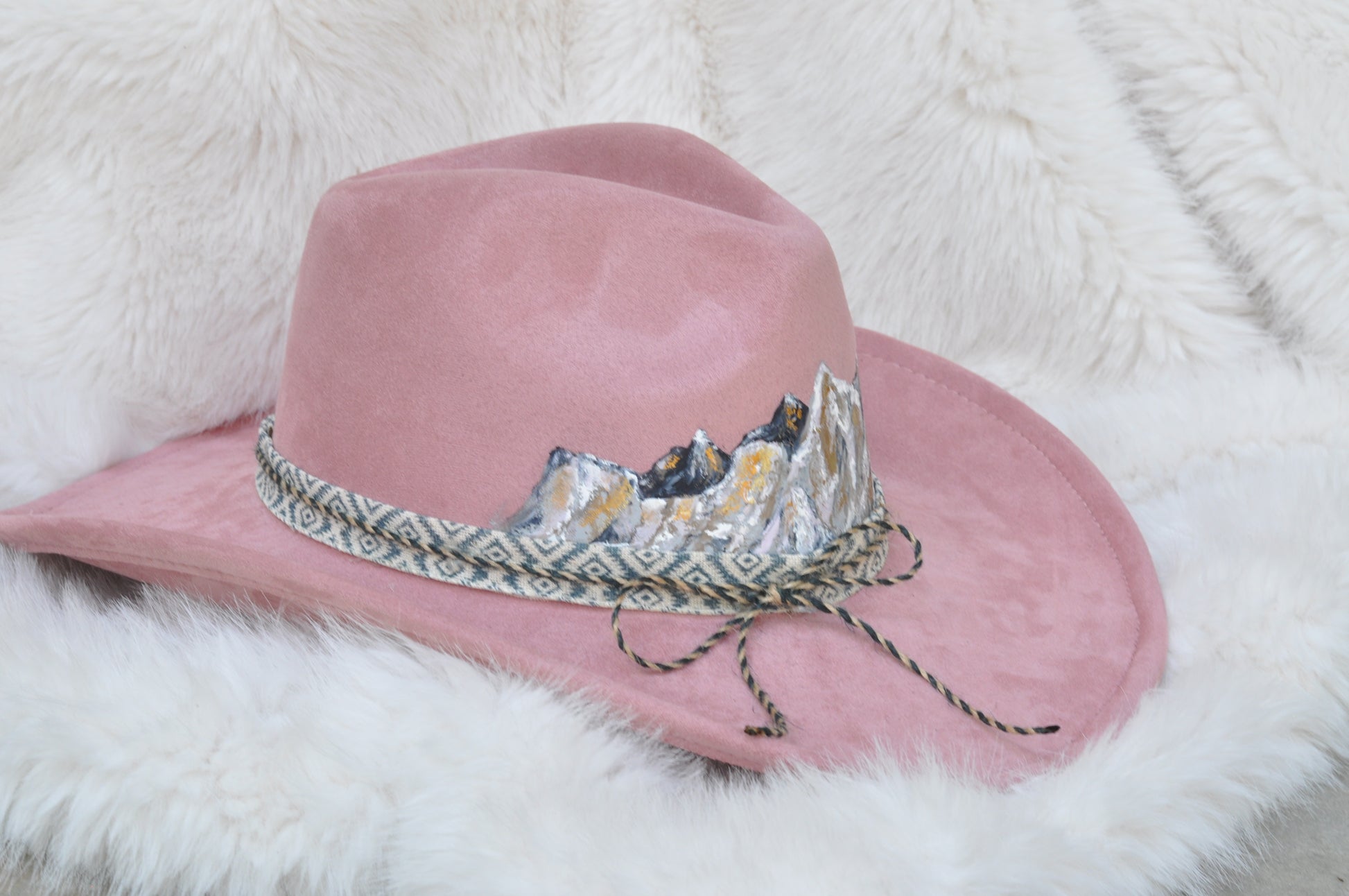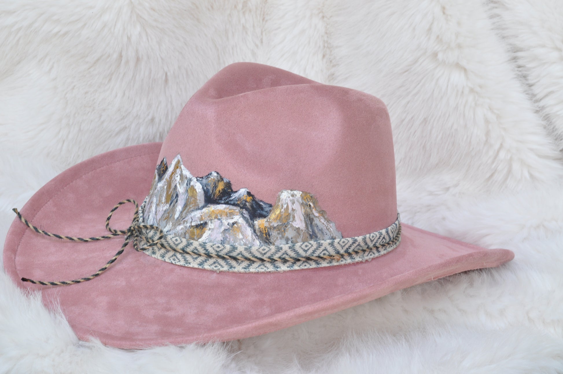 This soft pink vegan suede cowgirl hat is adjustable. On the inside of the hat are two brown ribbons you can tie to adjust the fit of the hat to different sizes.