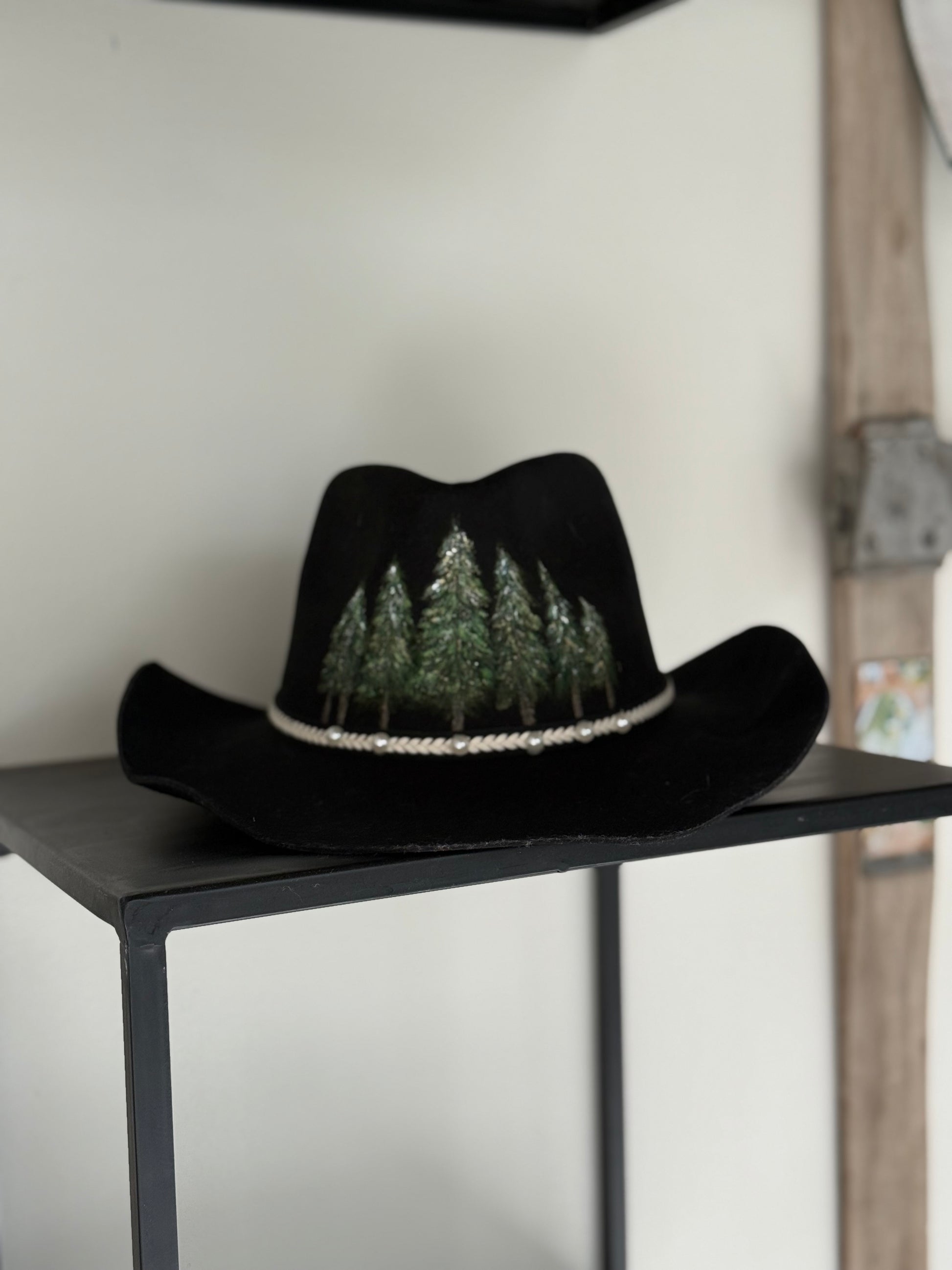 Turn heads with this hand painted black felt wide brimmed hat. Painted by myself with oil paints and a palette knife. Oil paint can last the weather and I have water proofed it with a water proof spray.